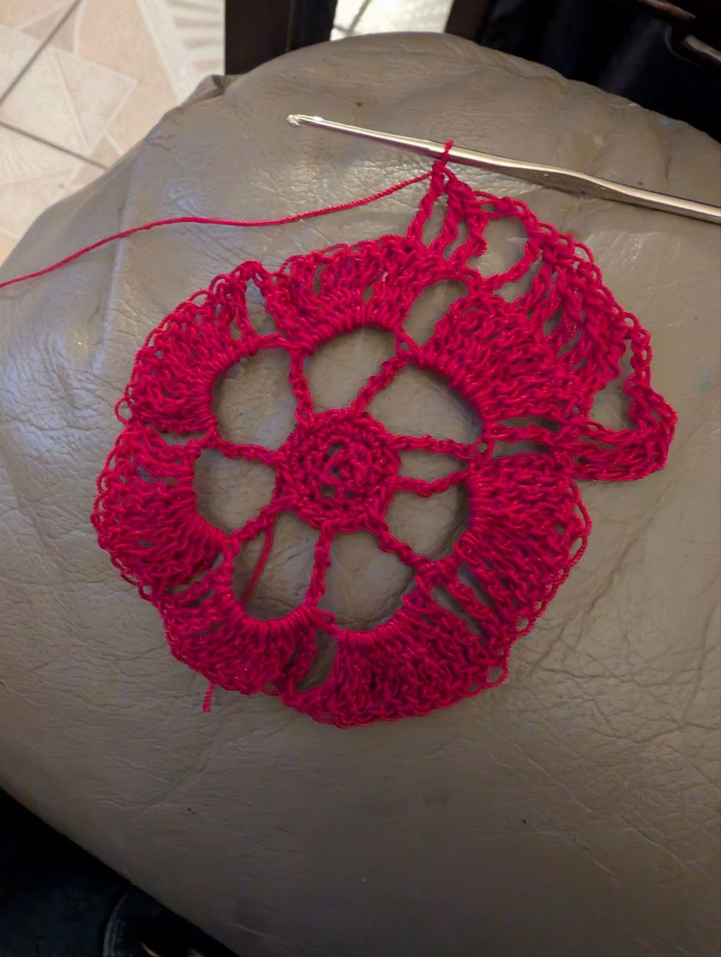 I also got some yarn to make doilies like my mom used to make. I can crochet I just prefer knitting. I spent all evening making this doily I had to start over a couple times. I am making progress though.