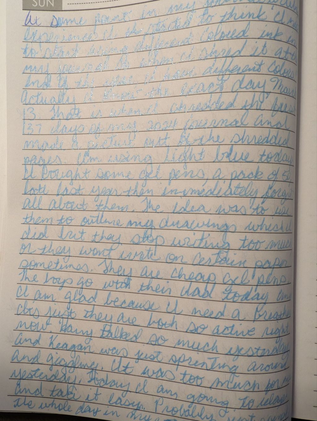At some point in my journal writing experience I started to think, ‘I need to start using different colored ink in my journal. So when I shred it at the end of the year, I have different colors.’