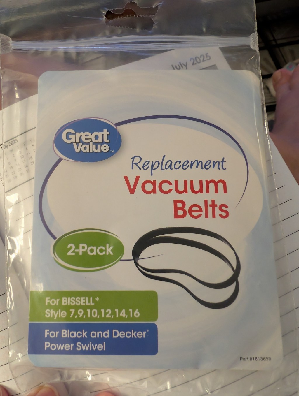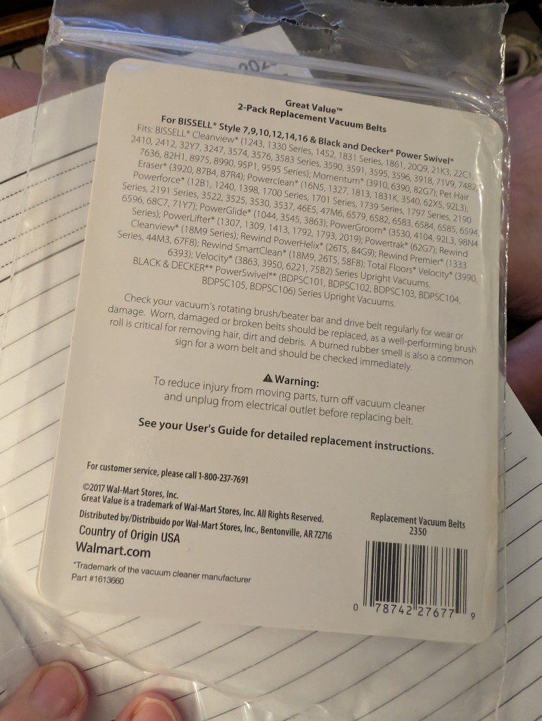 My son has never bought a vacuum cleaner belt so I tell him about how the belt broke and how I bought another one from Walmart and it was delivered and I was like and here it is and I hand him the package.