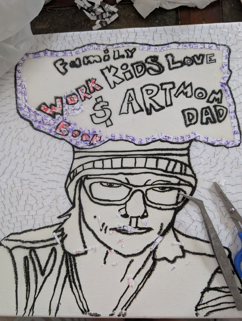 I started working on a drawing I made weeks ago. I traced a picture of myself then I put a bubble over it with all the things that were on my mind. I decided this drawing was one I wanted to make out of the paper shreds from my 2024 Journal.