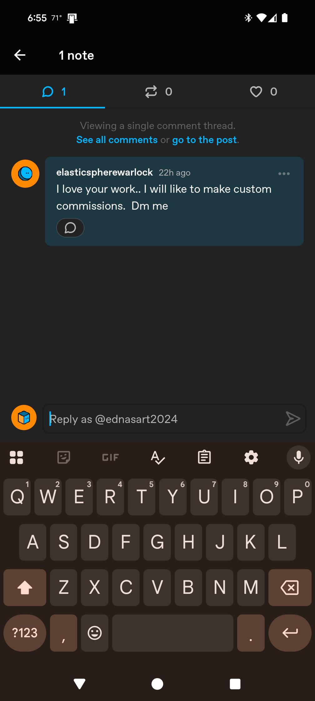 My blog posts here link to Tumblr, so I know I am going to get this message today. I think it is a bot and responds to anyone who puts art, or artist as a tag with their posts because every post where I put said tags in, this message pops up a few hours later.