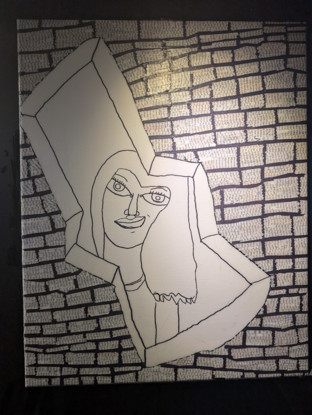 Yesterday I finished the bricks in my picture. Today I am going to line the inside of the hole the girl is looking through. Then I am going to make the sky around the girl, after that I will probably out line the inside and outside of the hole with black.