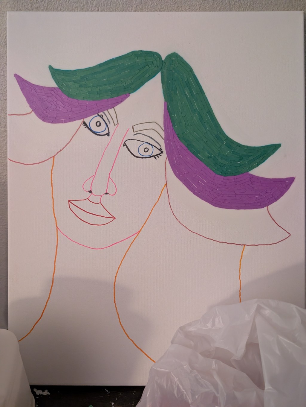I also did some work on my picture last night I added the purple hair. Red is next and then yellow will finish off the hair. In the original picture it is orange, but I have this neon bright paper that I bought months ago and thought it would be great for this picture but there is no orange in the package so I’m using yellow.