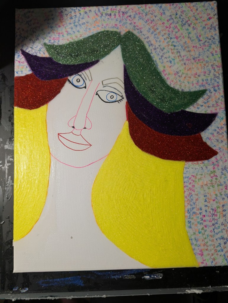 Back to my picture though, to finish it off I am using the pink paper I bought from Michael’s a couple days ago. I am also going to cover up the glitter parts with painters tape because I used a different type of glue for the glitter hair.