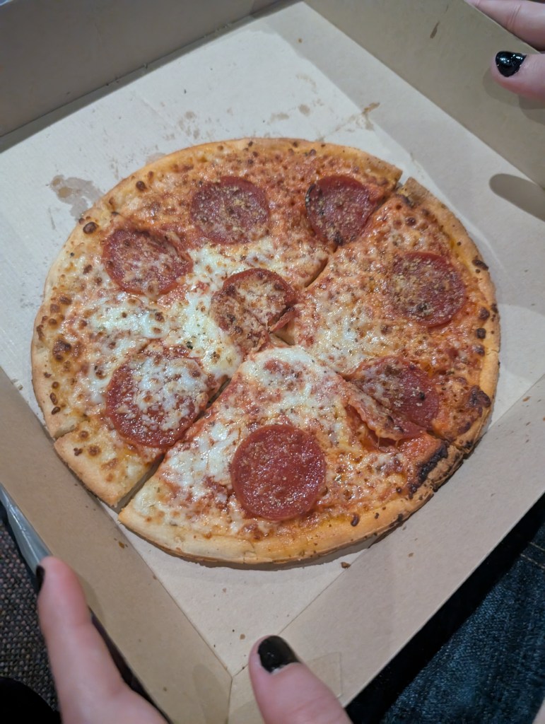 It was a tiny, tiny pizza. My son shushed me because the movie was starting and I was laughing so loud. I laughed every time he opened the box.