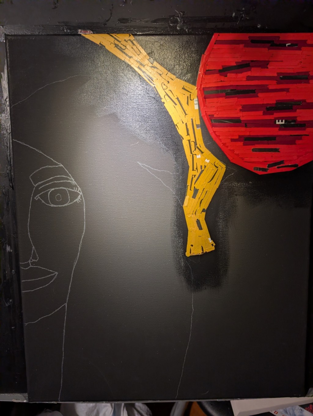 It’s going good so far, when you work with shredded paper it’s hard to find the right color but last night I pulled a handful of shredded magazine pages out of the bag and there was yellow right on top. That never happens, but I’m glad it did because I didn’t have a whole lot of energy last night but I wanted to start my picture. Next is orange, for the sun, so I’m hoping to get lucky again but I have a feeling that I am going to have to dig for the orange.