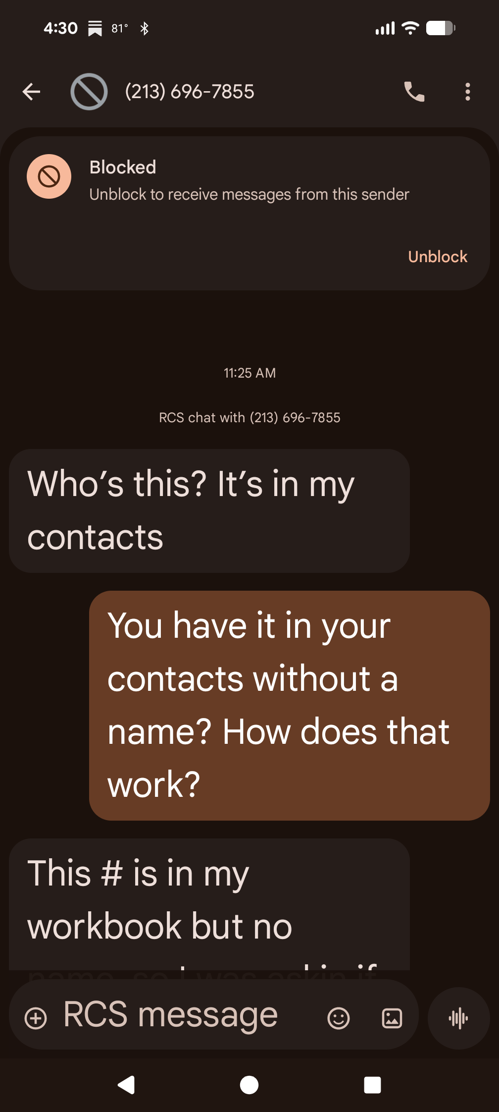 First I get the text asking who I am the number is in their contacts with no name, I responded. I don’t typically give out personal information to anyone, even people I know. You are seriously going to have to really pry it out of me or I am going to search you all over the internet.
