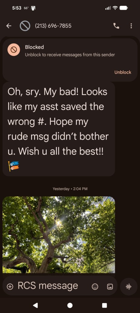 Readers, I got up from my desk in the middle of a work task and went outside and searched my front and back yard to make sure there wasn’t a person out there, then I blocked the number.