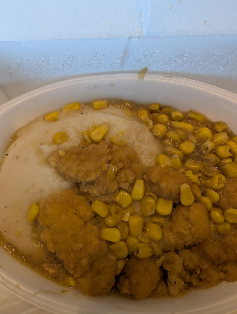 This was my lunch today, it came from a vending machine. It does not photograph well it was good, and the machine heated it up for me before it dispensed my meal. However, it cost $11.00, it wasn’t $11.00 good.
