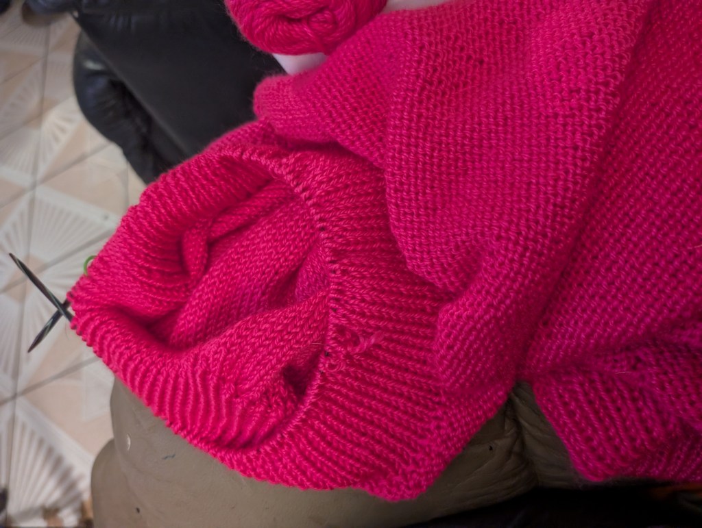 I also got a lot done on my pink sweater. I have 10 more rows before the body is done and I start on the sleeves.