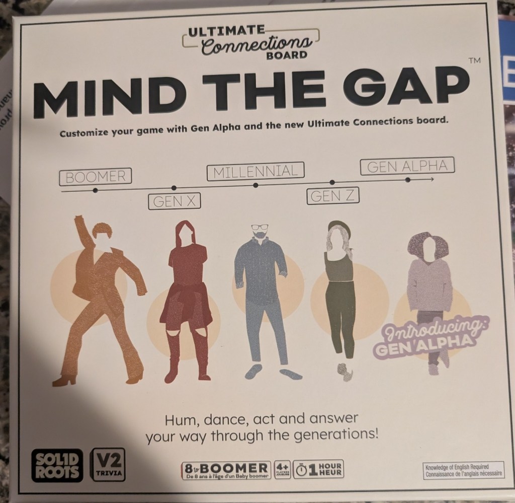 As you can see it is called Mind The Gap. It is a trivia game with questions from each of the different generations.