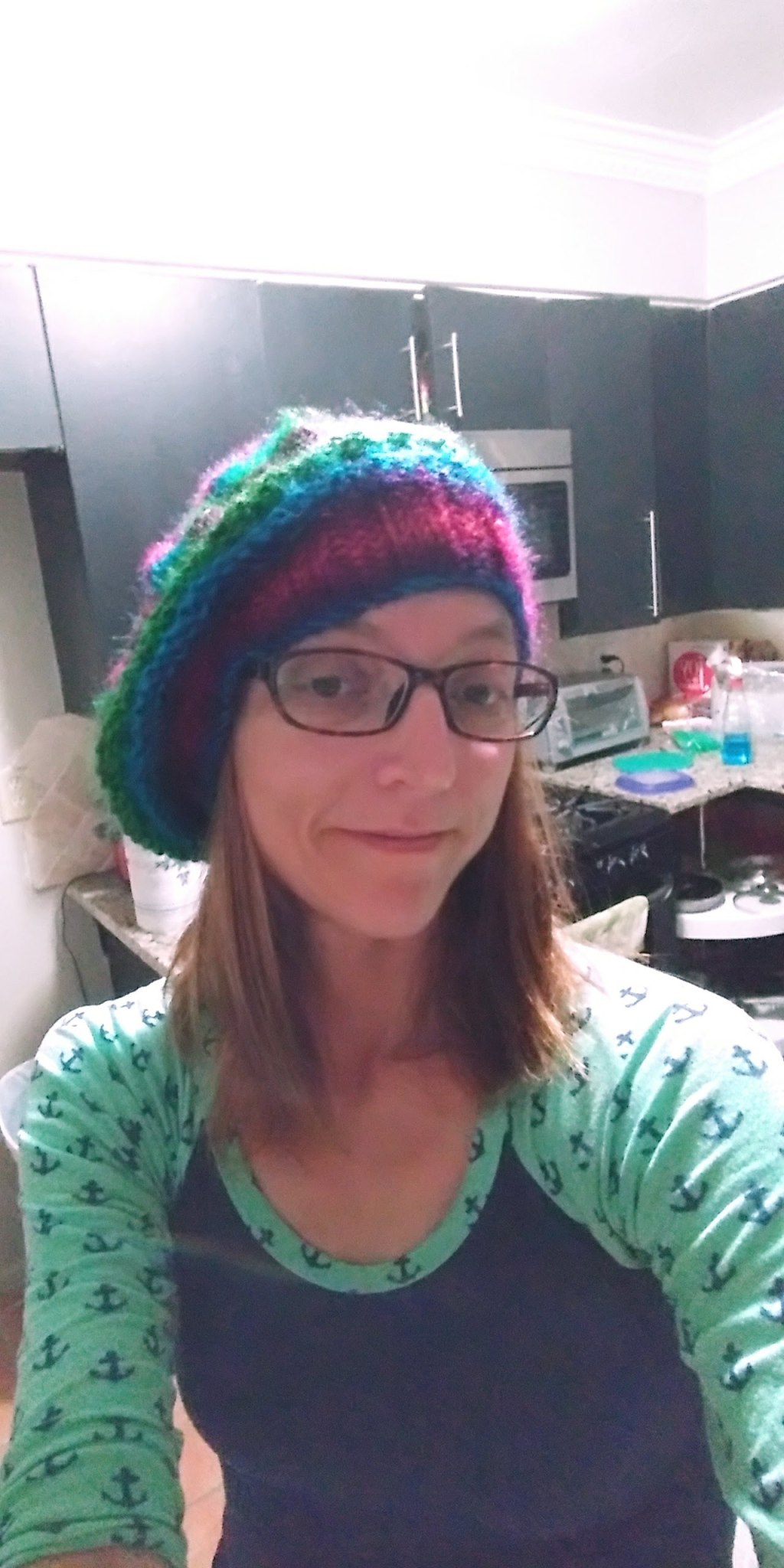 I’m wearing a beret I made. I remember this because it was really late at night when I finished knitting it, and I was very tired but couldn’t sleep so I took a picture.